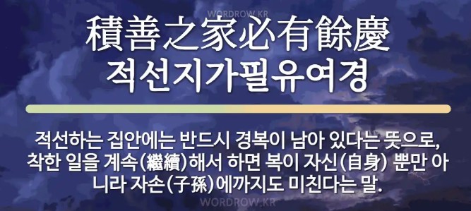 `적선지가(積善之家) 필유여경(必有餘慶)'이란 말은 주역(周易) 문언전(文言傳)의 한 구절로, 선한 일을 많이 한 집안에는 반드시 경사가 넘쳐난다는 의미의 가르침입니다.